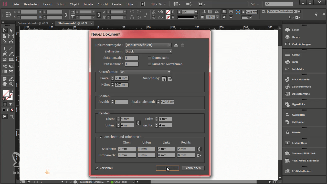 Zunächst legen wir in InDesign ein neues Dokument an und nehmen die wesentlichen Grundeinstellungen vor.