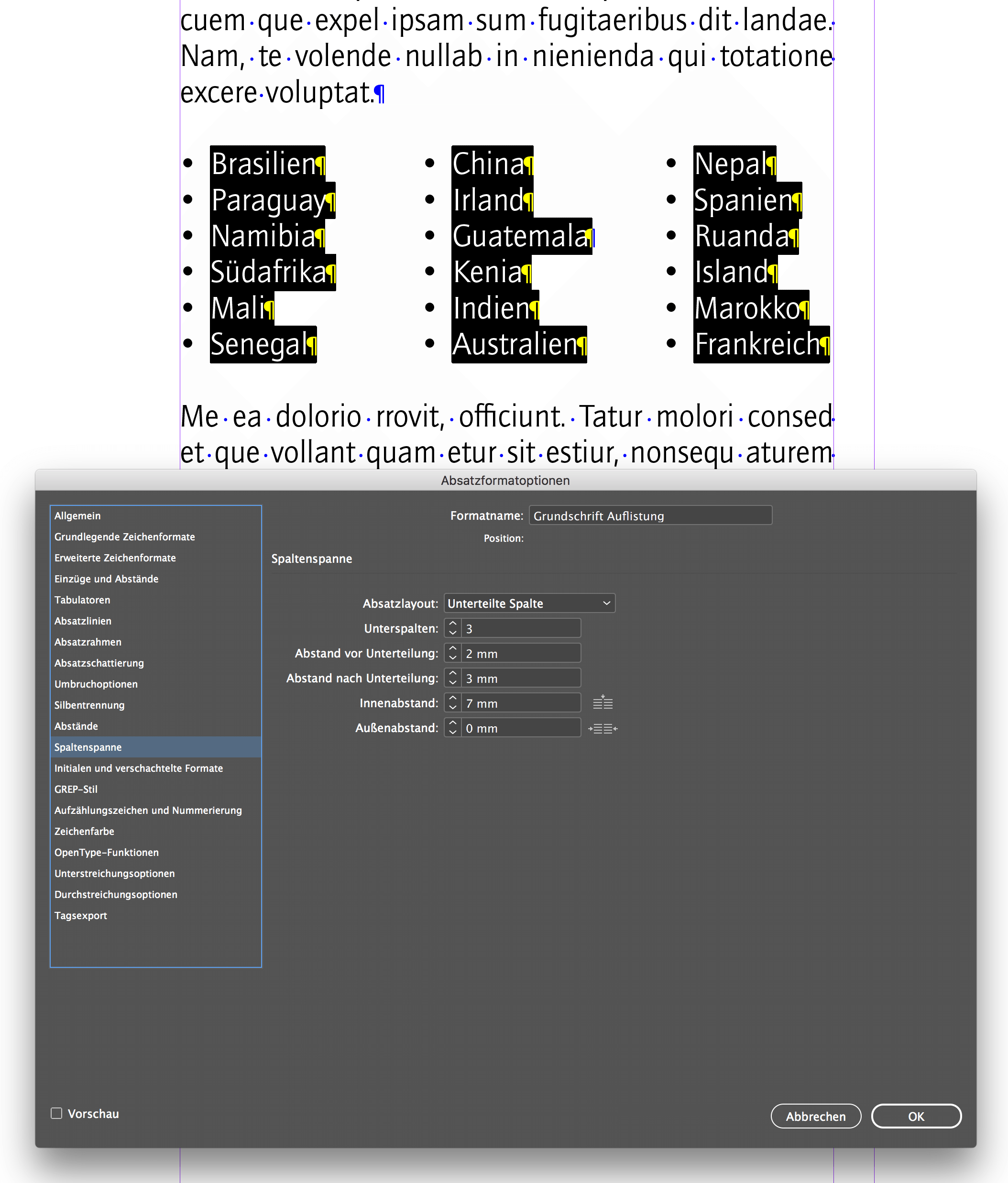 Absatzformate für verschiedene Textarten einzustellen, rentiert sich nicht nur für eine automatische Generierung der Spaltenspanne. Mit dieser Funktion lassen sich beispielsweise Reportagen, Hintergrundberichte, Kommentare oder Kurzmeldungen gleich im passenden Formatmuster anlegen. Hinweise dazu finden Sie im InDesign-Benutzerhandbuch.