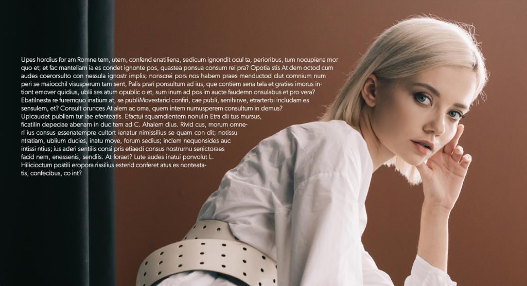 Im ersten von drei Beispielen soll in einer Modezeitschrift der Text den Rücken eines Models gleichmäßig umfließen. Öffnen Sie dazu zunächst das Textumfluss-Bedienfeld über Fenster → Textumfluss. Im Bedienfeld klicken Sie dann zunächst das dritte Icon mit dem Namen Umfließen der Objektform an. Sollte sich das Icon nicht anklicken lassen oder die einzelnen Funktionen ausgegraut sein, klicken Sie zunächst doppelt auf das Bild, auf dem Sie den Motivumfluss anwenden möchten.