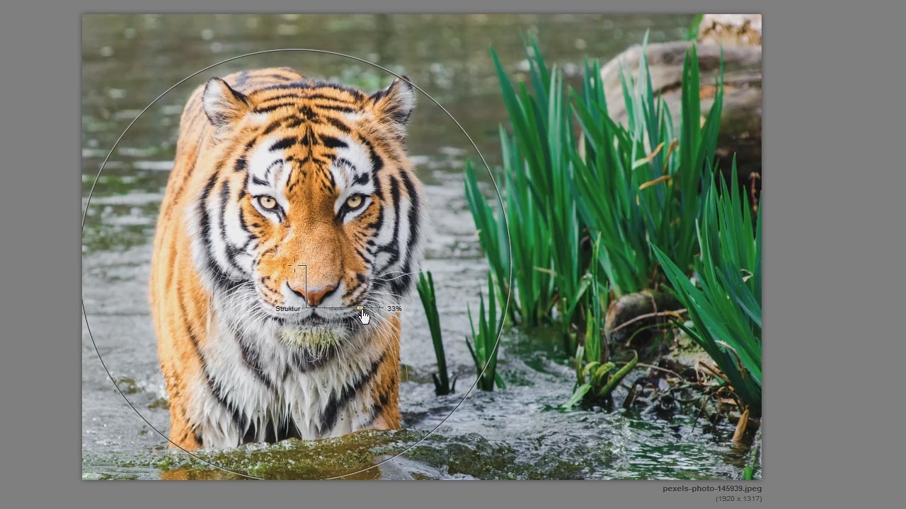 Im Bearbeitungsfenster wird zunächst über den großen Button Kontrollpunkt hinzufügen der Bereich gewählt, der bearbeitet werden soll. In diesem Fall wird der Kontrollpunkt auf die Nase des Tigers gesetzt. Das kleine Menü, welches nun am Kontrollpunkt angezeigt wird, ist eine kompakte Version der Einstellungen, die auf der rechten Seite vorgenommen werden können. Mit dem obersten Regler wird die Größe des Kontrollpunktes definiert. Darunter folgen die Einstellungsregler für Helligkeit, Kontrast, Sättigung und Struktur. Wenn diese Regler verschoben werden, verschieben sich auch die Regler im rechten Menü. Jeder dieser Regler wird nun leicht nach rechts verschoben, sodass der Tiger deutlich in den Vordergrund rückt. Anschließend können Sie auf eine freie Fläche innerhalb des Bildes klicken, um den Kontrollpunkt abzuwählen. Wenn Sie nun wieder die Regler im rechten Menü verschieben, bearbeiten Sie das komplette Bild.