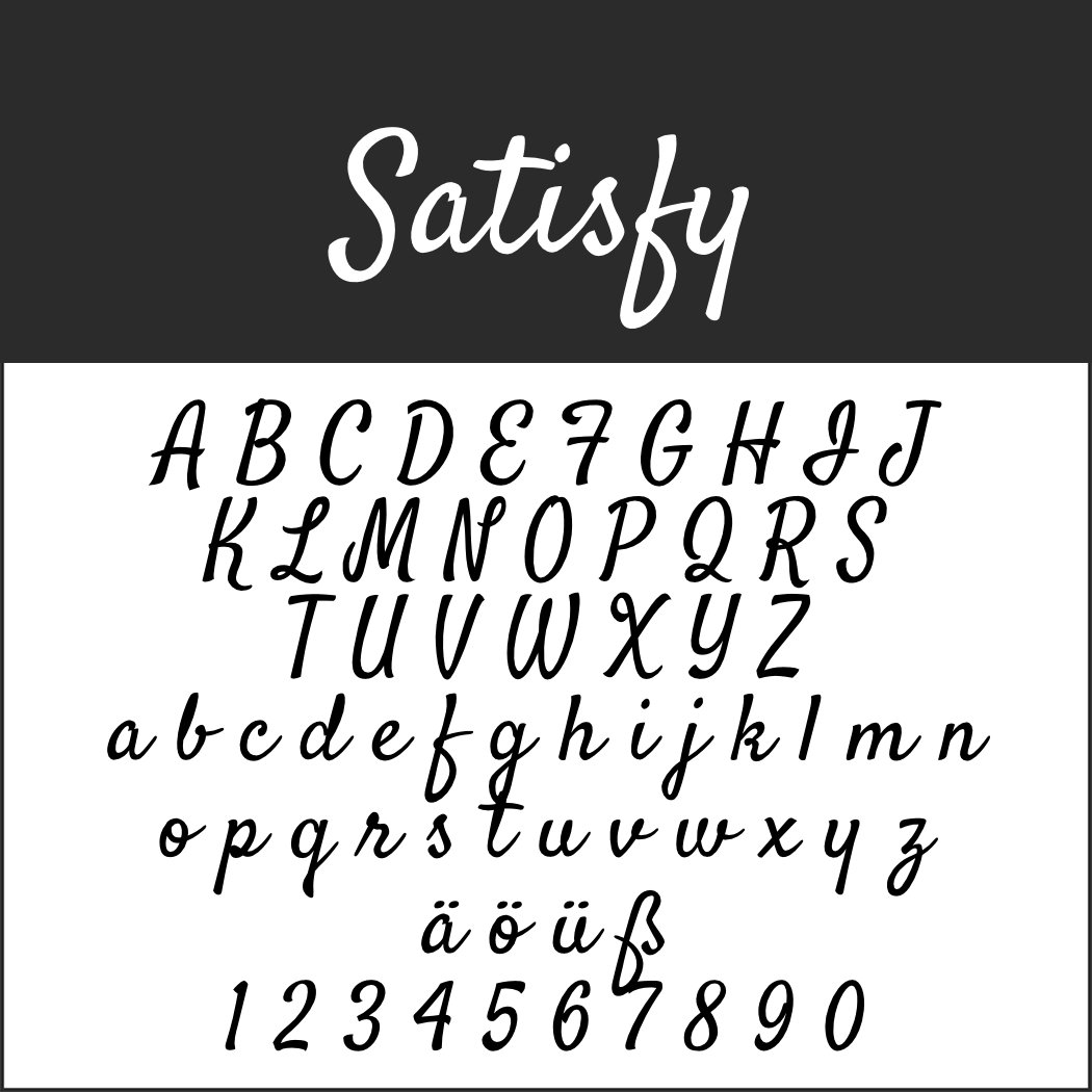 Eine Schriftdarstellung mit dem Titel „Satisfy“ fängt den Geist der Rock 'n' Roll-Schrift mit ihren fließenden Schreibschriftbuchstaben, den Ziffern 0-9 und den Sonderzeichen ä, ö, ü, ß ein. Der Text hebt sich in Weiß von einem dunklen Hintergrund ab.Satisfy