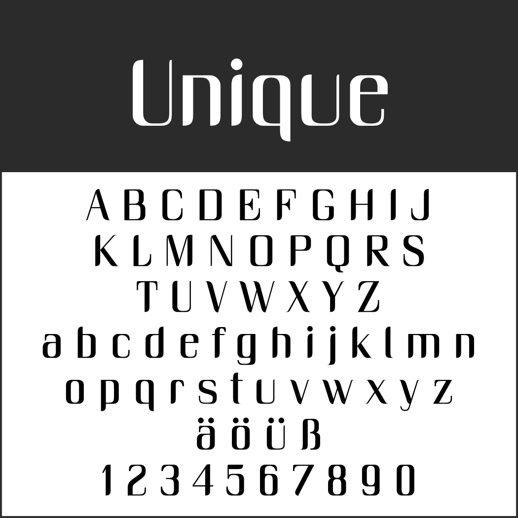 Das Auffallendste an diesem Font mit schickem Art-déco-Flair sind die ausgeprägten Oberlängen.