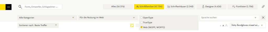 Mit der verbesserten Komprimierung wird WOFF2 seit 2018 von W3C als Webstandard empfohlen, und auch die variablen Fonts lassen sich in diesem Format gut handhaben. Bei vielen Schriftanbietern fallen zwar auch die TrueType- und OpenType-Fonts in die Kategorie „Webfonts“, einige Anbietern erlauben aber inzwischen eine ganz gezielte Suche nach Fonts im WOFF-Format wie zum Beispiel Fontshop.