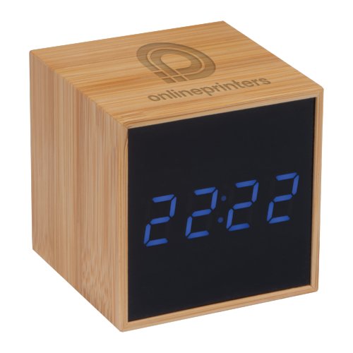 - elegante Tischuhr mit Bambusummantelung, schwarzem Display und blauer LED-Anzeige