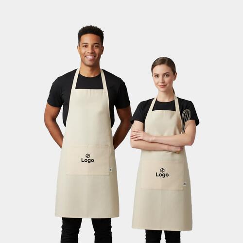 Beige Baumwollschürze mit Nackenband und Taschen.