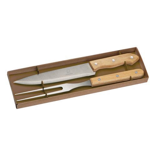 - Ein Set für Fleischliebhaber, Gabel und Messer aus Edelstahl mit Holzgriffen zum Aufschneiden von Braten, Gegrilltem oder Steaks in einer umweltfreundlichen Verpackung