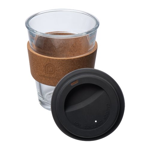 - Trinkbecher aus Glas mit Silikondeckel und einer Manschette aus Kork