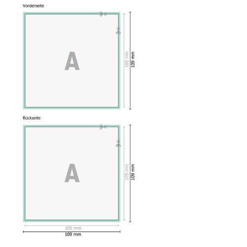 - Datenformat (inkl. 2 mm Beschnitt): 10,9 x 10,9 cm