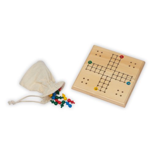 Braunes Holz-Ludo-Spiel mit Spielfiguren und Würfel.