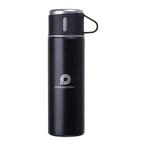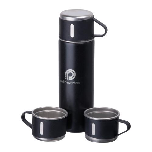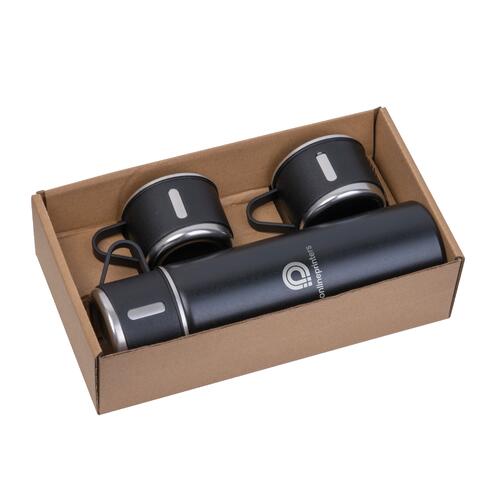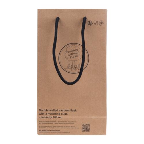 • Isolierflaschenset bestehend aus einer doppelwandigen Isolierflasche (400 ml) aus Edelstahl mit Schnellverschluss und drei Trinkbechern (120 ml) aus Edelstahl mit Kunststoffummantelung