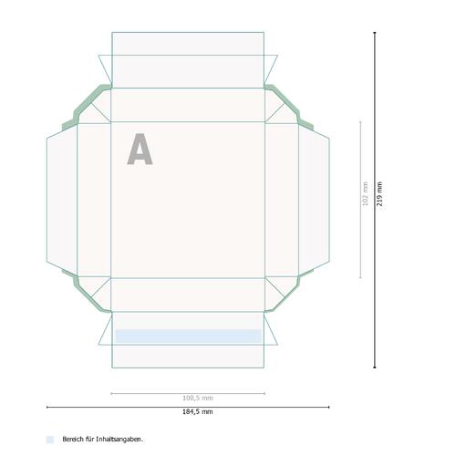- Die gesetzlichen Pflichtangaben (Inhaltsangaben, Mindesthaltbarkeitsdatum, Hersteller/Inverkehrbringer etc.) werden im Rahmen des Produktionsprozesses automatisch eingefügt. Bitte beachten Sie die gekennzeichneten Bereiche im Datenblatt sowie in der Druckvorlage