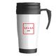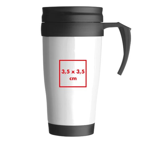 Weißer Kunststoffbecher mit Henkel und Deckel.