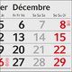 - Kalendarium beinhaltet Monate und Tage in drei Sprachen (DE, EN, FR) sowie die deutschen Feiertage