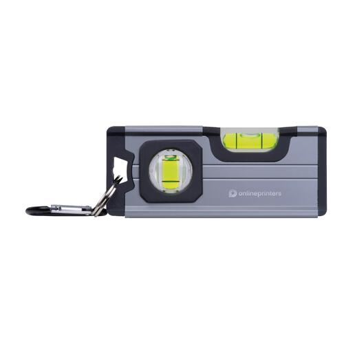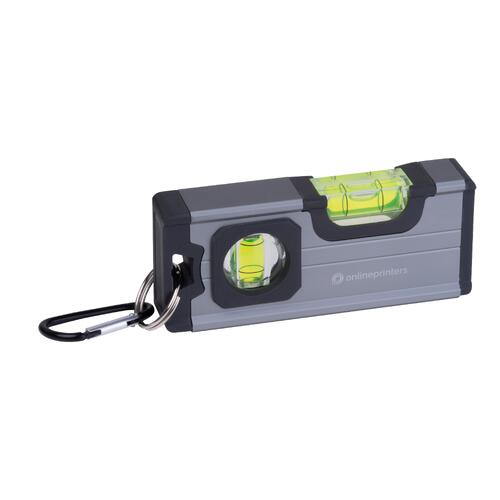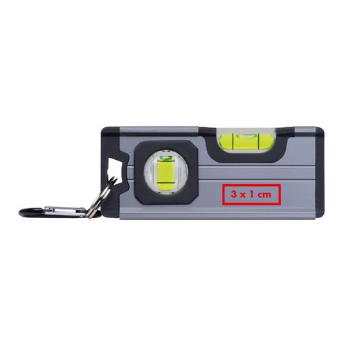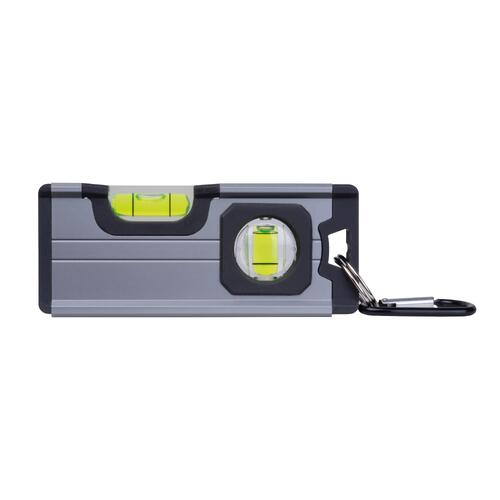 - Mini-Wasserwaage aus Aluminium mit Kunststoffapplikationen aus ABS, zwei Libellen, Magnet auf der Unterseite und einem Karabiner