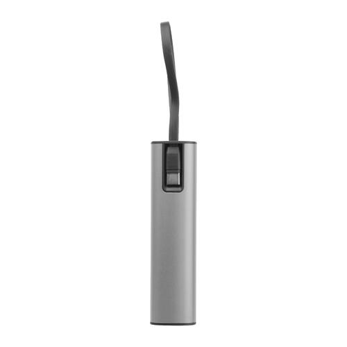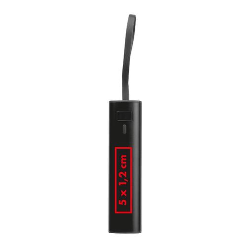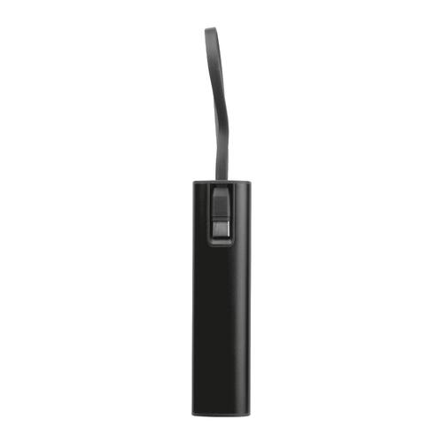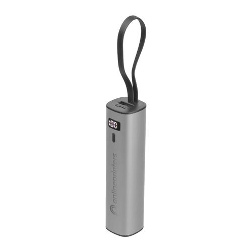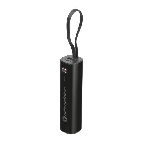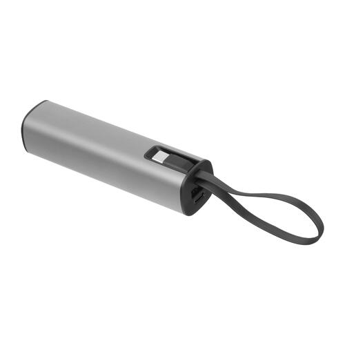 • Powerbank aus Aluminium mit einem 5.000 mAh Li-Ionen-Akku, Ladestandsanzeige und integriertem USB-C Ladekabel