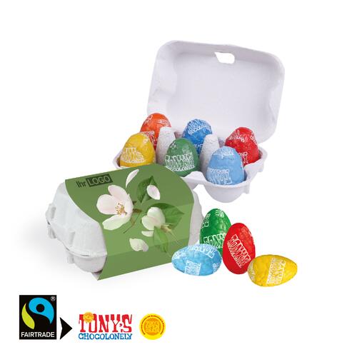 - 6 Stück Tony‘s Ostereier (ca. 75 g) bunt gemischt. Fairtrade® zertifiziert.