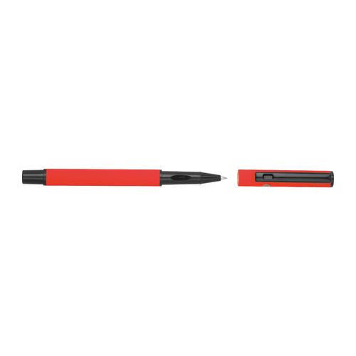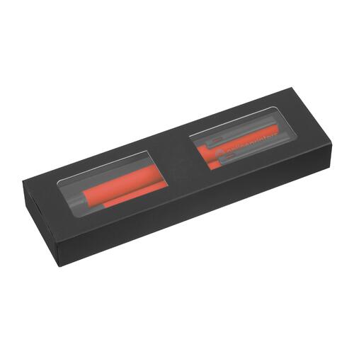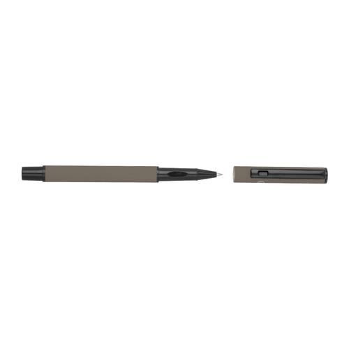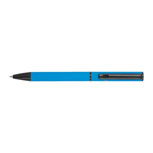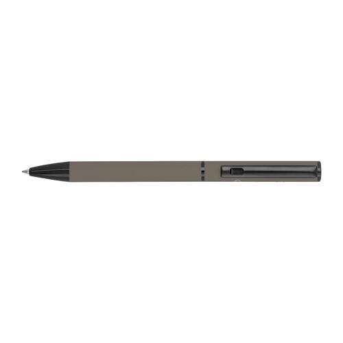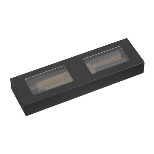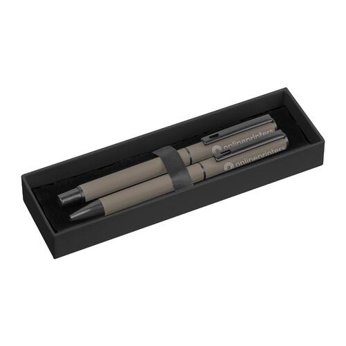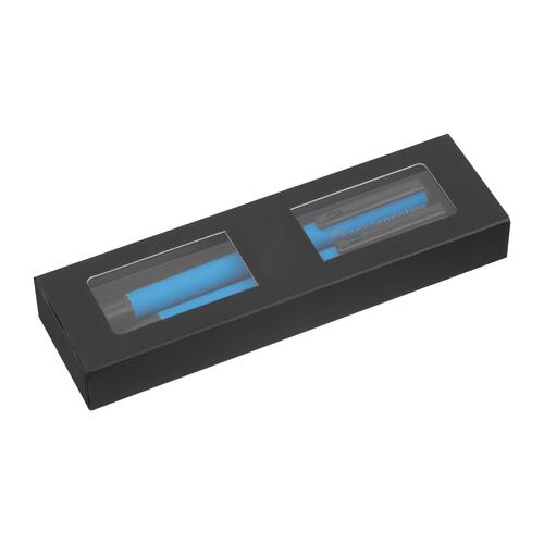 • Schreibset aus Aluminium bestehend aus einem schwarzschreibenden Rollerball und einem blauschreibenden Drehkugelschreiber (Kunststoffgroßraummine) und einer Box