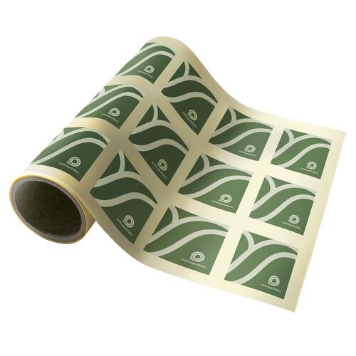 Übereinander gestapelte, Etiketten mit grünem Druck auf transparentem Hintergrund