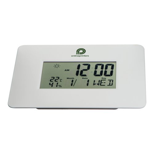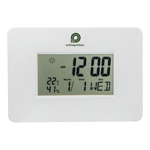 - Digitale Wanduhr mit Kalender, Alarm und Schlummerfunktion, Thermometer und Hygrometer (automatische Aktualisierung der Werte alle 20 Sekunden) sowie einer Wetter-Anzeige