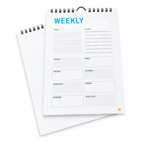 - Wochenkalender mit Spiralbindung als 54- oder 55-Blatt-Version (nur mit Titelblatt, oder mit Titel- und Zusatzblatt)